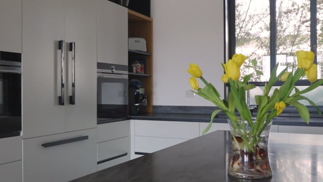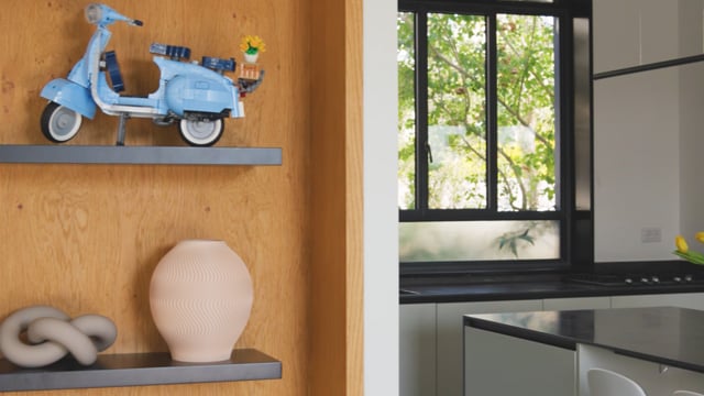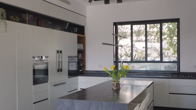 התוצאה היא מטבח אלגנטי, פונקציונלי ובעל נוכחות אדריכלית ברורה – כזה שמחבר בין עיצוב מוקפד לביצועים טכניים גבוהים של חומר מתקדם.
