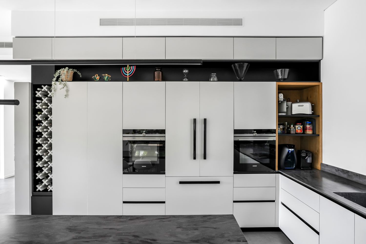 הקוריאן מאפשר יצירת משטחים רציפים ללא תפרים נראים לעין, עם עמידות גבוהה לכתמים ולשימוש יומיומי אינטנסיבי – פתרון אידיאלי למטבח פעיל. שילוב החומר עם חזיתות בהירות, נישות עץ טבעי ופרטי פרזול שחורים יוצר קונטרסט מאוזן בין חום, עומק ומודרניות נקייה.