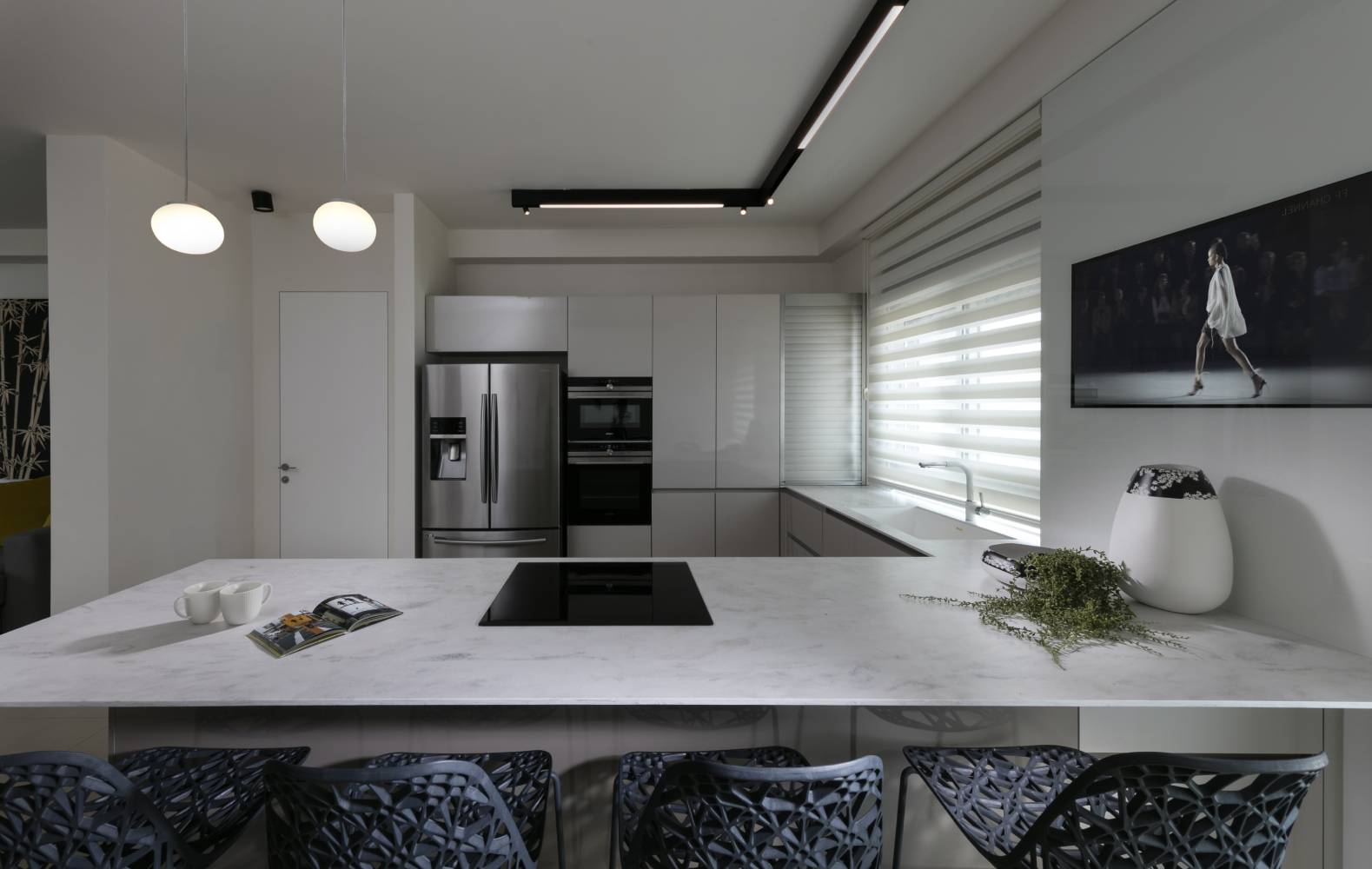 משטח האי הגדול יוצר במה פונקציונלית ורחבה לבישול, אירוח ואכילה, כאשר המרקם הלבן-משויש של הקוריאן מוסיף עומק עדין מבלי להעמיס על העיצוב. קו הארונות האחורי בגווני אפור בהיר משתלב בהרמוניה עם הלובן של המשטח, ומדגיש את האלגנטיות המונוכרומטית של המטבח.